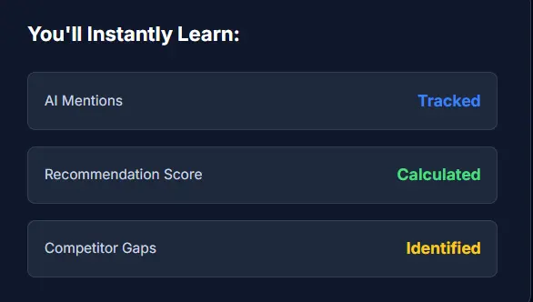 The AI Visibility Checker tests whether your brand appears in responses from ChatGPT, Perplexity, and Claude when people search for products or services in your category. It identifies mentions, recommendations, competitor placements, and the context in which AI describes your brand. This gives you a clear picture of your current AI search visibility.