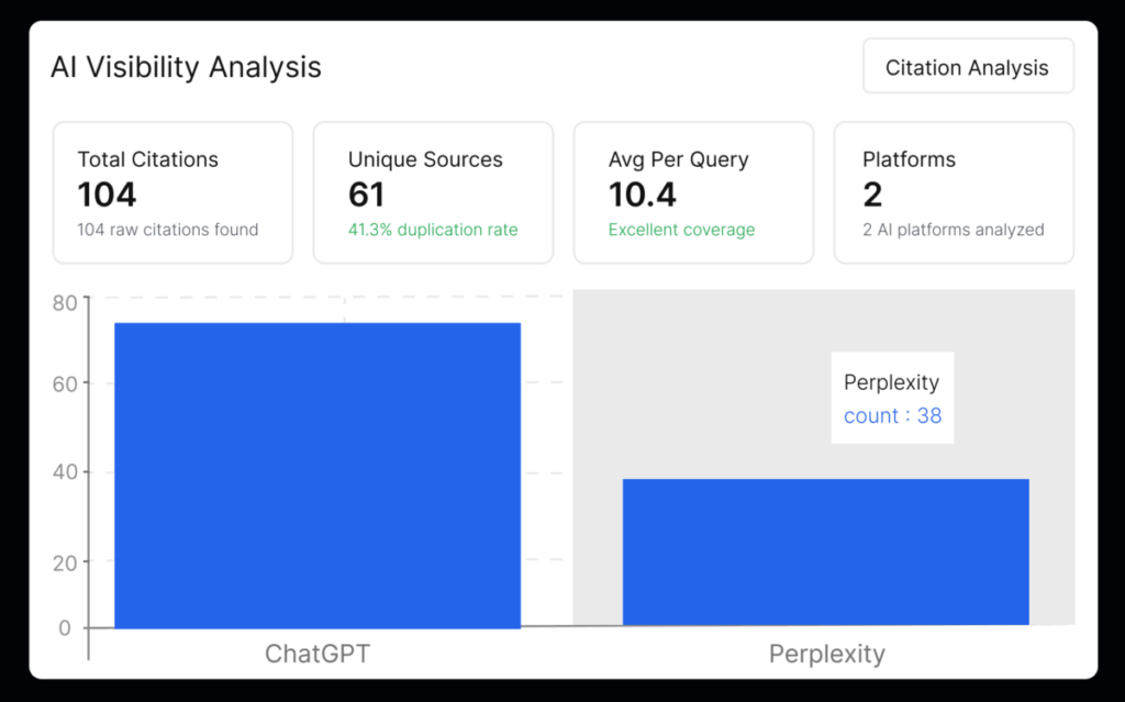 The Citation Analysis tab shows which sources AI relies on to generate answers — including citation counts per platform, top domains, frequency distribution, and high-authority sources. This helps you understand which references influence AI and where your competitors gain visibility.