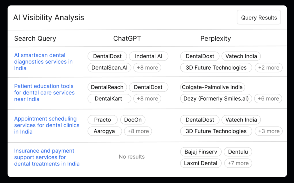 The AI Visibility Tracker turns your one-time audit into an ongoing performance dashboard. By adding your own LLM queries or generating them automatically, you can track exactly how often your brand appears, where competitors dominate, and which sources AI relies on to generate answers.