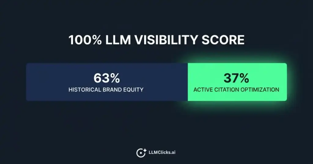 Research shows that 63% of your LLM visibility is driven by historical brand equity. This refers to the accumulated digital footprint your brand has built over time, which has already been ingested into model training data. The remaining 37% is controlled by active citation optimization. This involves the structured content, schema, listicle placements, and authoritative source coverage that brands build deliberately right now.