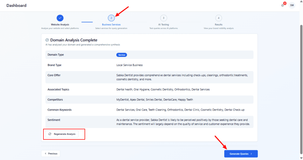 Verify AI’s domain synthesis — ensure the domain type, core offer and topics match your business.