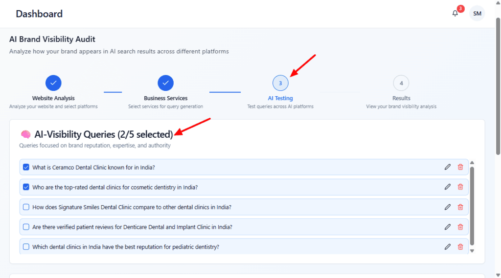 Select the AI-visibility queries that best reflect reputation/authority topics you want tested.