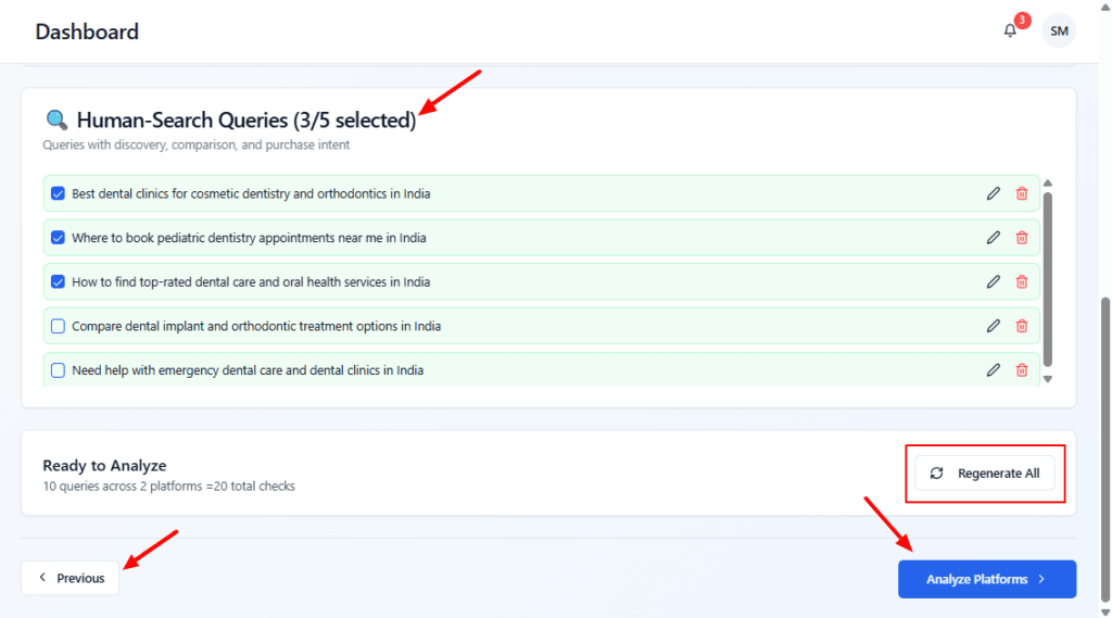 Click Regenerate All to get a fresh set of suggested human queries if these don’t fit.