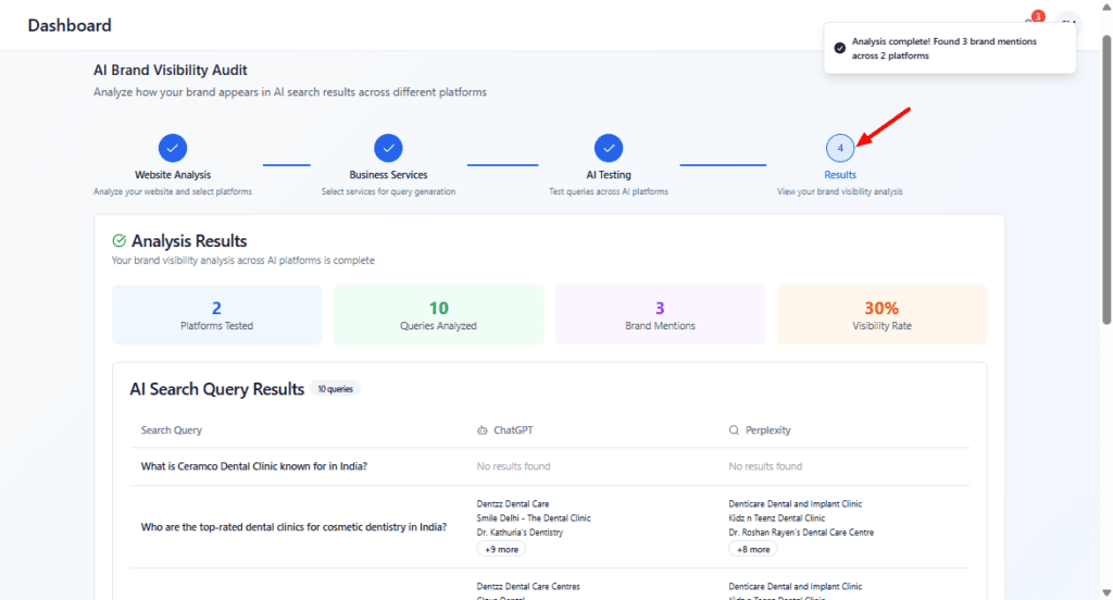 Scroll the AI Search Query Results table to inspect each query and see which platforms returned your brand (and which returned “No results found”).