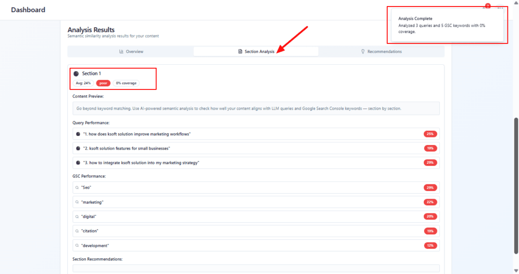 Go beyond keyword matching. Use AI-powered semantic analysis to check how well your content aligns with LLM queries and Google Search Console keywords — section by section.