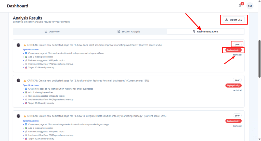 This is the Recommendations tab of the Analysis Results. It turns the scores into actionable tasks.