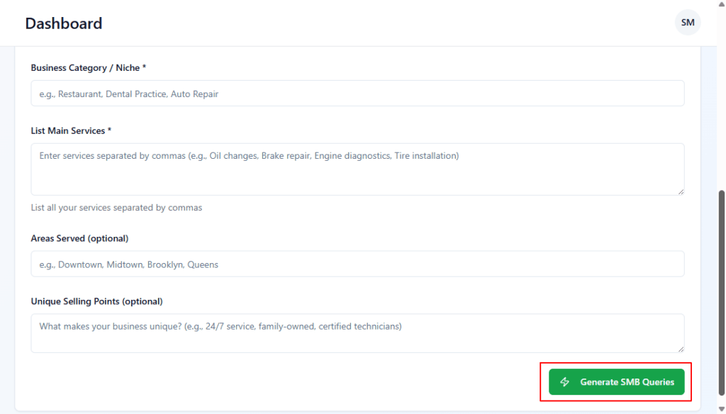 • The tool sends this info to the AI and creates a set of local search queries tailored to your niche, services and area.