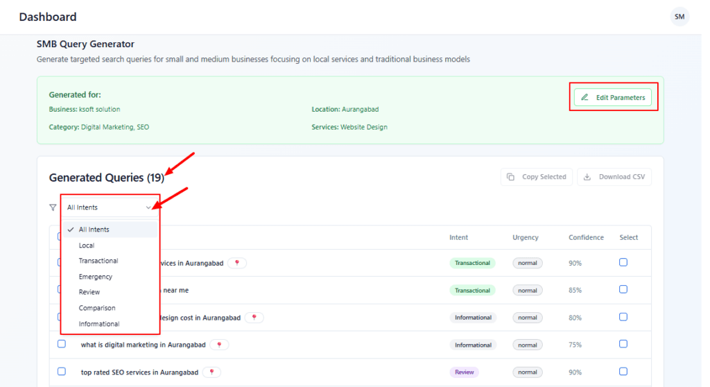 • Click Edit parameters in the green banner if you want to change the business niche or services, update locations, and re-run generation to get a fresh query set.