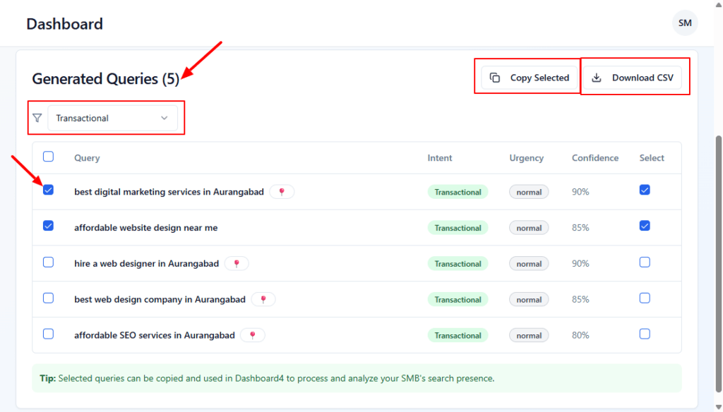 • Use the intent dropdown (here set to Transactional) to show only the type of queries you need, e.g., for Google Ads or service pages.