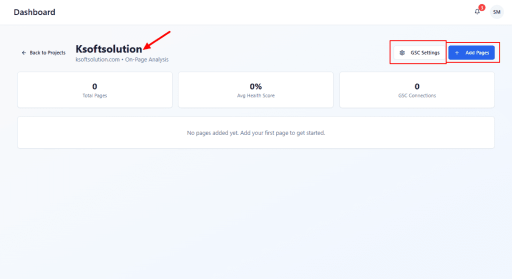 After selecting View, you’ll be taken to the project’s On-Page workspace to Add Pages, connect GSC, and run audits or use the Wizard to follow guided optimization steps.