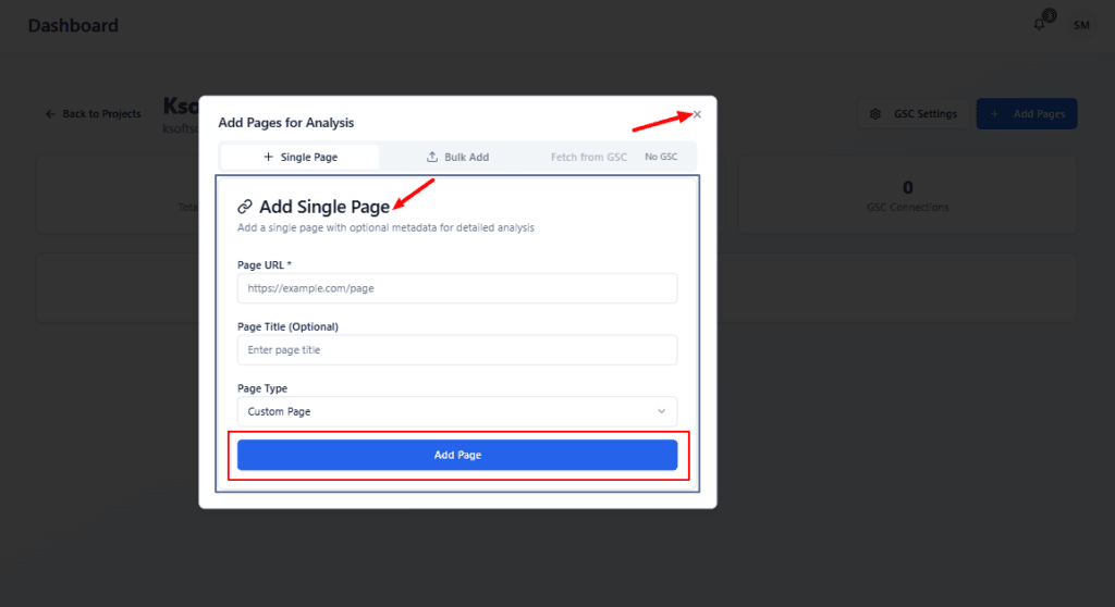 Click Add Page to queue the page for analysis. After adding, the page appears in the Pages table and the audit will run (status will change from queued → in progress → completed).