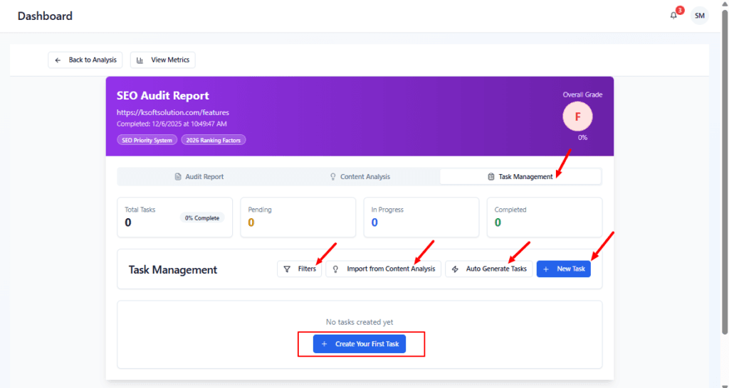 Use the Content Analysis tab for content-specific recommendations and Task Management to convert audit findings into assignable tasks.