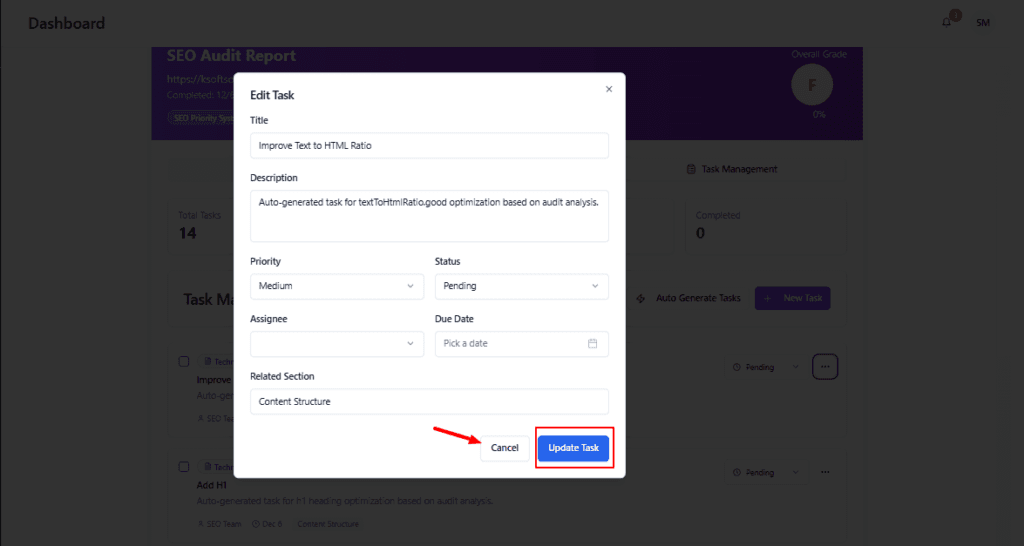Automatically creates tasks based on audit failures (e.g., “Improve Text to HTML Ratio”). Click to generate tasks that match audit findings.