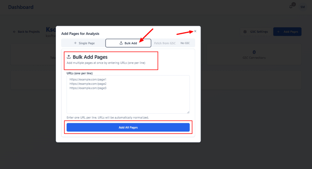 If you need to add many pages at once, switch the modal to the Bulk Add.