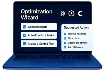 Turn insights into actions. The Optimization Wizard transforms audits, mappings, coverage gaps, and embedding scores into a prioritized, step-by-step AI SEO improvement plan.