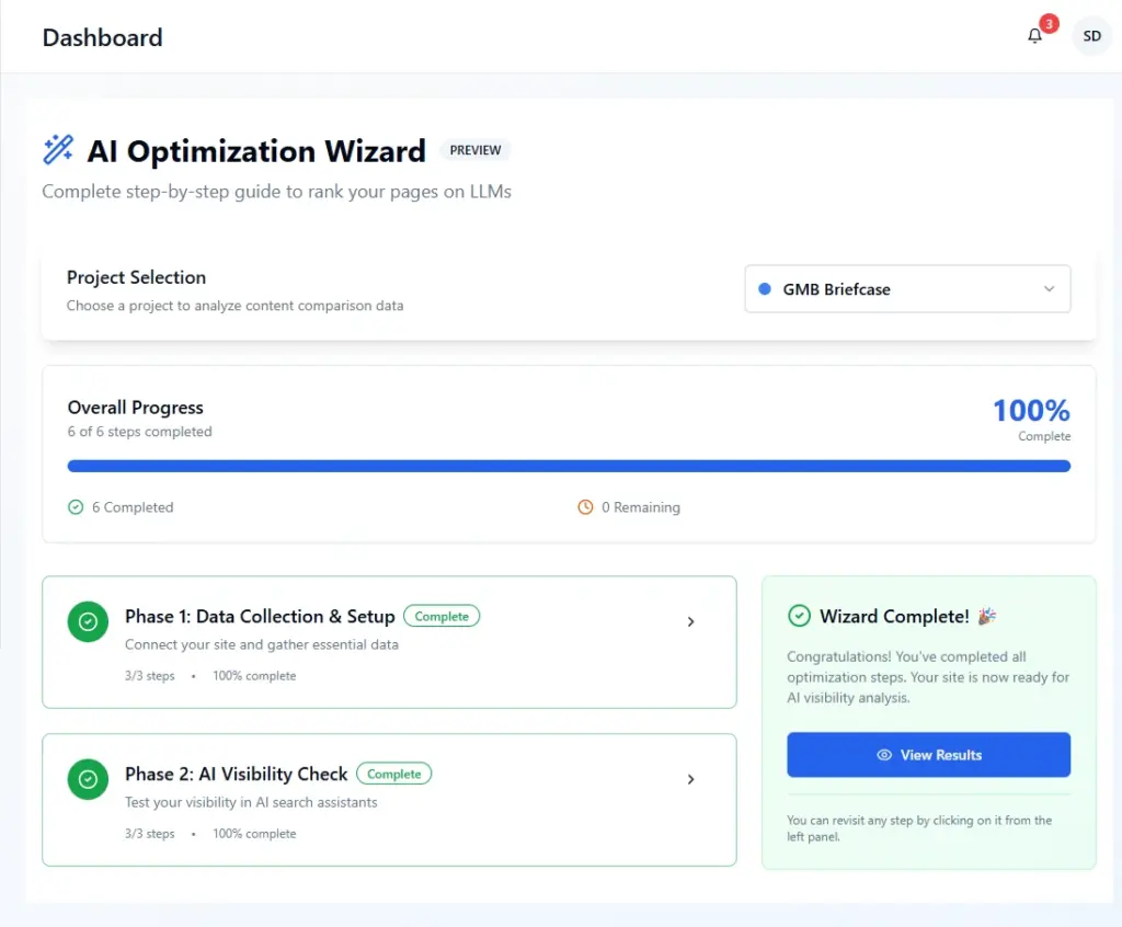 Yes. The Wizard is built to improve your visibility across AI assistants like ChatGPT, Perplexity, Copilot, and Google AI, as well as traditional SEO signals. It blends LLM-focused recommendations with on-page, content, and semantic improvements that also help organic search.