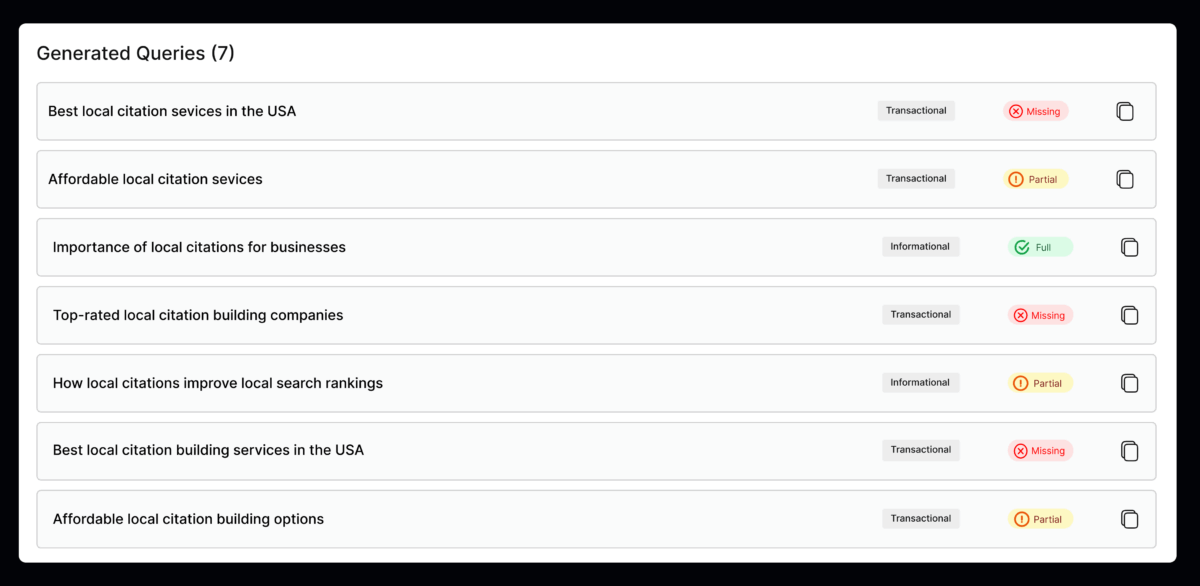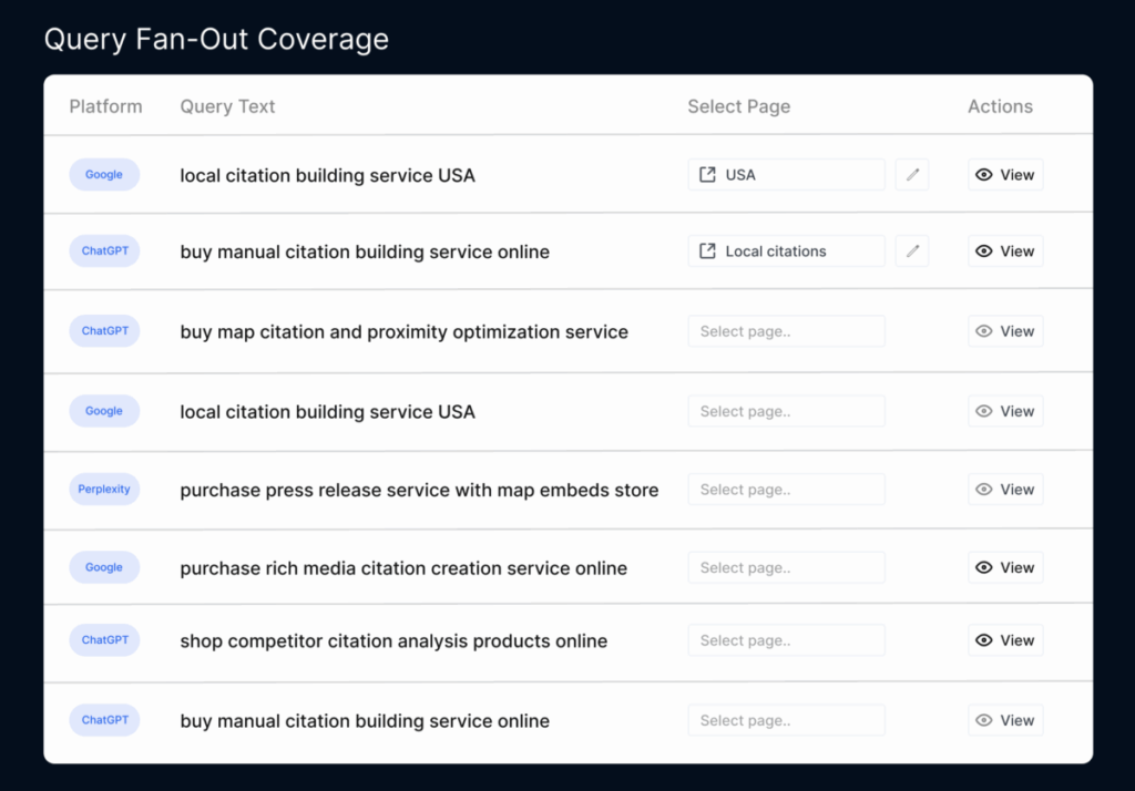 LLMs don’t cite content for one keyword match — they reward complete topical coverage. Query Fan-Out Coverage shows whether your content answers all the related queries a buyer (or AI) might ask.