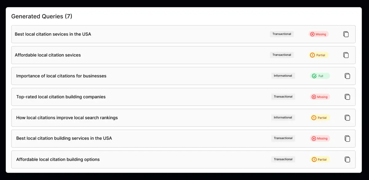 Each query is checked against your content. Results are marked as covered, partial, or missing, with an overall coverage score.